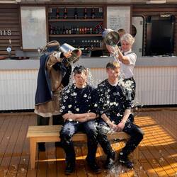 Zusammensein und den Tag ausklingen lassen. Und Hoffnung auf besseres Wetter morgen. Mit Teambildung anlässlich Hariets Geburtstags.