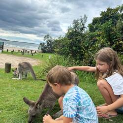 How amazing it has been here in Crowdy Bay. The Kangaroos are so beautiful and gentle. I am in awe of being able to get this close and pat them. Such an amazing experience for the kids. What a coolBaca lagi