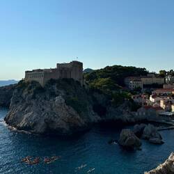 Danach nehmen wir an einer „Game of Thrones“-Führung durch Dubrovnik teil. Wir laufen 2,5 Stunden durch die wunderschöne Altstadt und erkunden die “Fort Lovrijenac”, um die verschiedenen Drehorte der Serie zu besichtigen. Unser Guide Edi, der als Lastträger bei den Dreharbeiten arbeitete, versorgt uns mit spannenden Fakten und bringt uns mit seinen trockenen, aber witzigen Sprüchen immer wieder zum Lachen. Auch über die bewegte Geschichte der Stadt hat er viel zu erzählen.