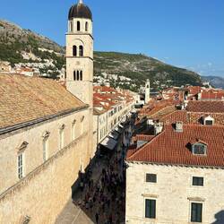 Unser Airbnb ist sehr hübsch und gut gelegen. Vom Eingang aus sehen wir bereits die imposante Stadtmauer von Dubrovnik. Voller Vorfreude machen wir uns auf den kurzen Weg in die Altstadt, die nur fünf Minuten entfernt ist. Die Altstadt ist atemberaubend schön, aber leider auch rappelvoll mit Touristen. Es heisst, Dubrovnik sei die Stadt mit den meisten Touristen pro Einwohner, und täglich überfallen etwa 15.000 Besucher die Stadt. Trotz Fussgängerzone geht es in der Innenstadt hektisch zu und her.