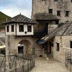 Nachdem es die ganze Nacht geregnet hat, wagen wir uns am Morgen nach draussen. Wir gehen durch die malerische Altstadt von Mostar und erhaschen bereits einen Blick auf die bekannte alte Brücke “Stari most”, die über den Fluss Neretva führt. Links und rechts vom Fussweg befinden sich Souvenirshops und Restaurants. In vielen Shops werden Kaffeesets aus Kupfer oder Metall verkauft. In diesen soll nach traditioneller Art der Kaffee in Bosnien serviert werden.