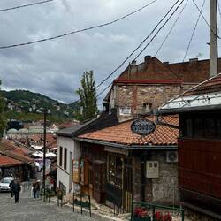 Nach einem leckeren Frühstück verbringen wir unseren zweiten Tag in Sarajevo damit, die Sehenswürdigkeiten der Stadt bei einem Spaziergang anzuschauen und durch die schönen Strassen zu schlendern, die von Cafes und kleinen Shops gesäumt sind. In den vielen Schaufenstern sehen wir vor allem farbenfrohe Süssigkeiten und Schmuck. Vor den Läden werden Souvenirs und kupferne Cafesets zum Verkauf ausgestellt.