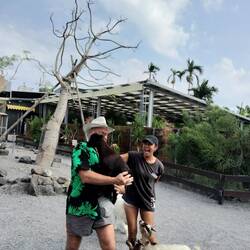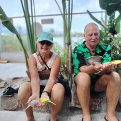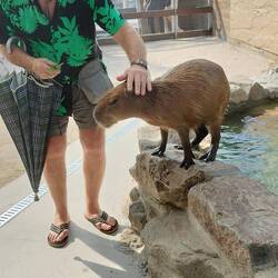 Rob and I had breakfast at 7 11 before others up. Left 10.30 and found waterfront cafe. Small waves but lots of slash from typhoon last week. Diggers burying it. Drove to Nonfango temple. They left incence over 3 floors. Had peanut rolled icecream done in thin wraps. Next stop Homing petty zoo with sheep goats turtle birds meerkats guinea pigs and capybaras. Could feed them all. Drove to Hotel Kilin in Jiaoxi for night. Dinner if street food and beers from 711. Even got Sara in pool for us to help teach. Can't float!Read more