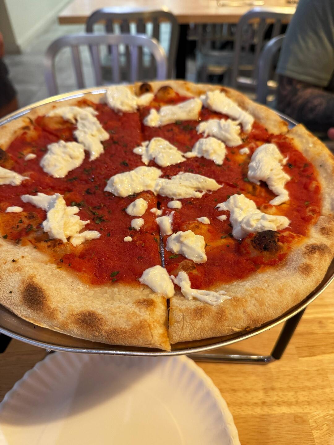 Sourdough crust, burratta(sp?) cheese, lemon zest, delicious! Donna’s sourdough starter is Minerva! Gotta take that off the baby list, darn.