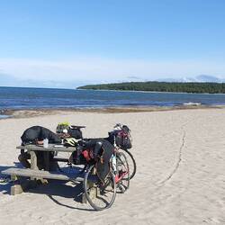 Nous finissons par arriver à l'île où Valentin nous a donné RDV puis c'est parti pour un débrief autour d'une, puis deux, puis trois pilsner. Il faut dire que c'est la meilleure bière possible avec cette chaleur et des kilomètres de vélo dans les jambes.