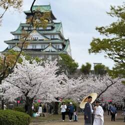 Die prächtige Burg von Osaka lag circa 15 Gehminuten von unserem Hotel entfernt. Wir besuchten den Nishinomaru Garten, von welchem aus wir einen brillanten Blick auf die Burg hatten. Wir genossen den Anblick der Kirschblütenbäume und konnten ein japanisches Paar bei ihrer Trauung im Park beobachten.