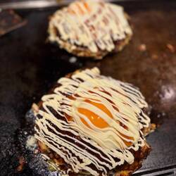 Okonomiyaki wird oft als „japanischer Pfannkuchen“ beschrieben: ein herzhafter Teig mit Kohl und verschiedenen Zutaten, der auf einer heißen Platte gebraten und mit spezieller Sauce, Mayo und - wenn gewünscht - mit Bonitoflocken serviert wird.