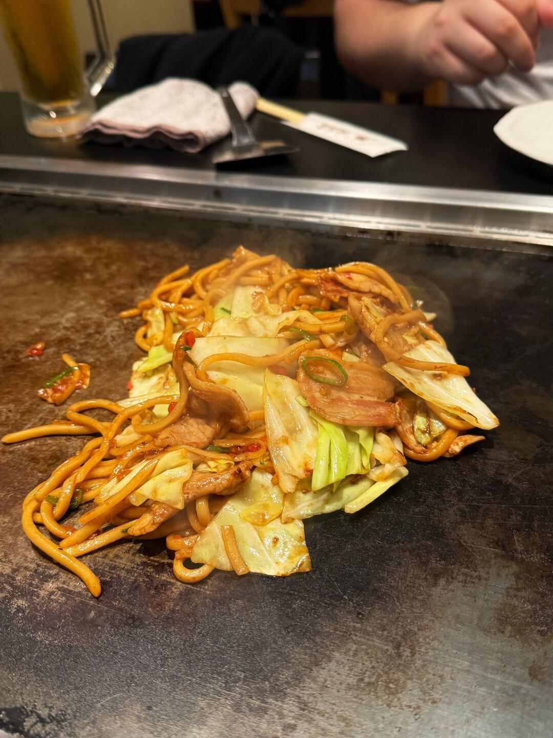 Wir haben zwei echte Klassiker der japanischen Küche probiert – Yakisoba und Okonomiyaki. Dank der heißen Grillplatte an unserem Tisch wurde das fertige Gericht noch lange warm gehalten.