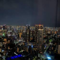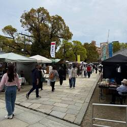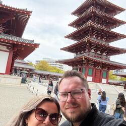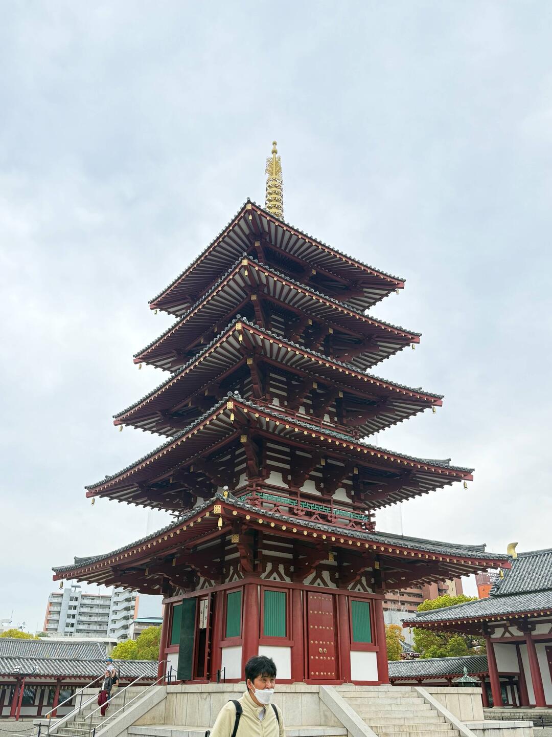 Die fünfstöckige Pagode konnte man emporsteigen. Dies ließen wir uns nicht nehmen. Eine Wendeltreppe führte durch mehrere Etagen, die kleine Ausstellungen und religiöse Darstellungen zeigen. Oben angekommen wurden wir mit einem schönen Blick über das Tempelgelände und die Umgebung von Osaka belohnt. Rund um den Tempel gab es einen Markt, auf welchem man viele kulinarische Produkte kaufen konnte.
