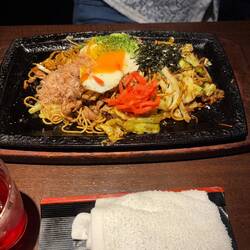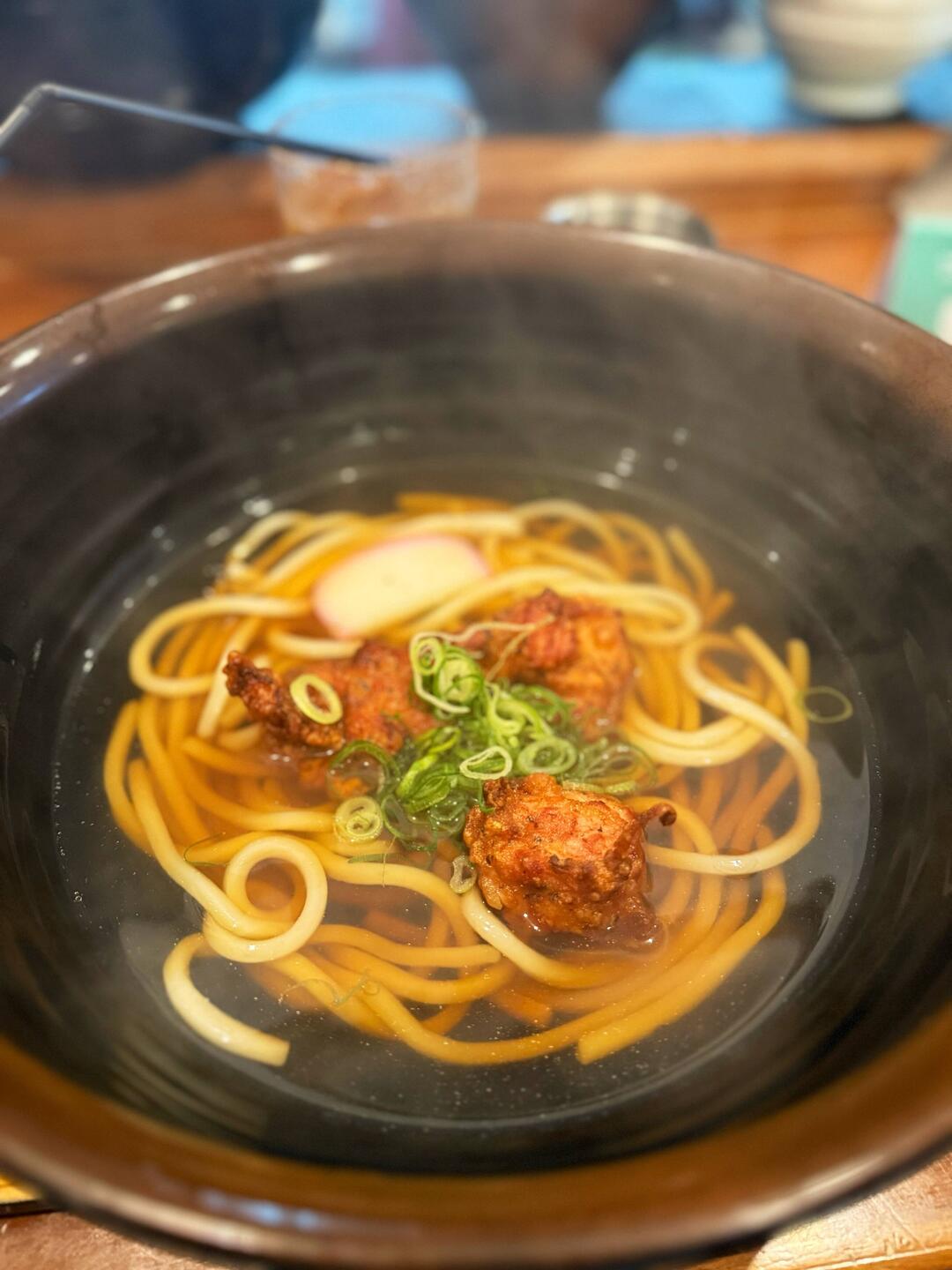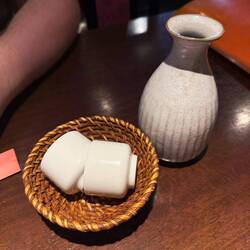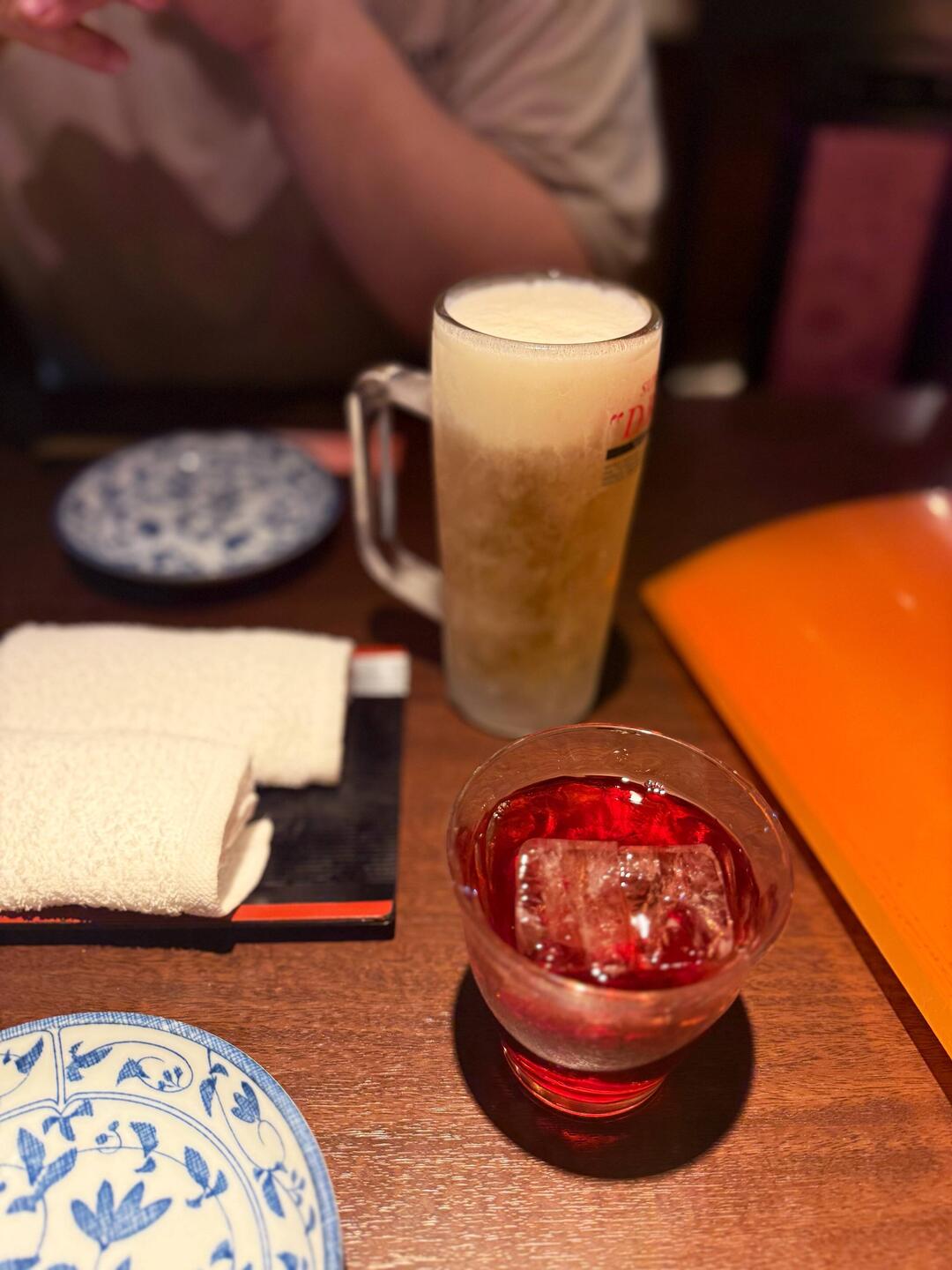 Wir bestellten Yakisoba (gebratene Nudeln), Karaage (frittiertes Hähnchen), Yakitori (Hähnchenspieße), dazu ein Bier und Erdbeerwein. Uns war jedoch nicht bewusst, dass es sich bei den Spießen auch um Hähnchenlunge und -Leber handelt 🫩 wir spülten alles mit einem großen Sake nach.
