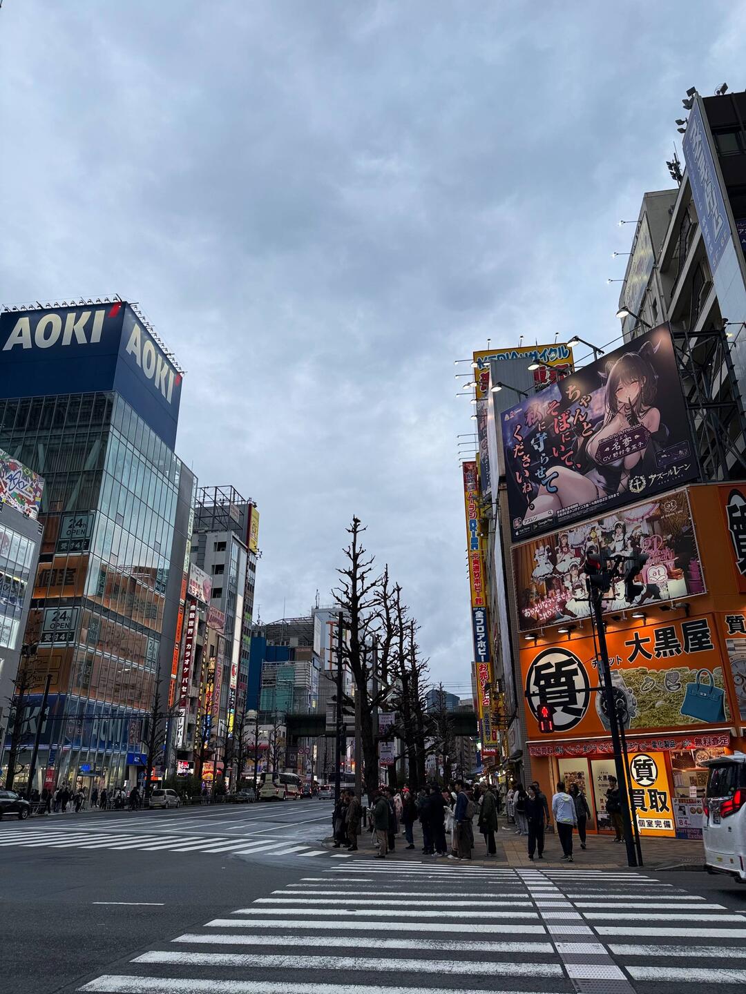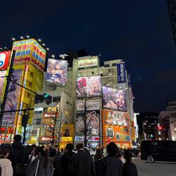 Wir spazierten weiter zum Stadtteil Akihabara. Zwischen leuchtenden Neonreklamen, riesigen Anime-Bildschirmen und unzähligen Geschäften tauchten wir mitten in Japans Popkultur ein.