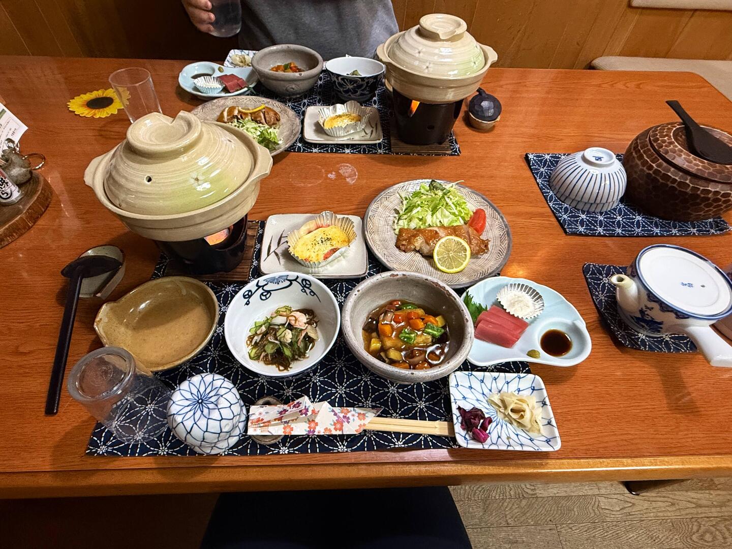 Zum Abendessen gab es einen heißen Eintopf begleitet von vielen kleinen, liebevoll angerichteten Schälchen: frisches Sashimi, zartes Fleisch, geschmortes Gemüse und eingelegte Spezialitäten.