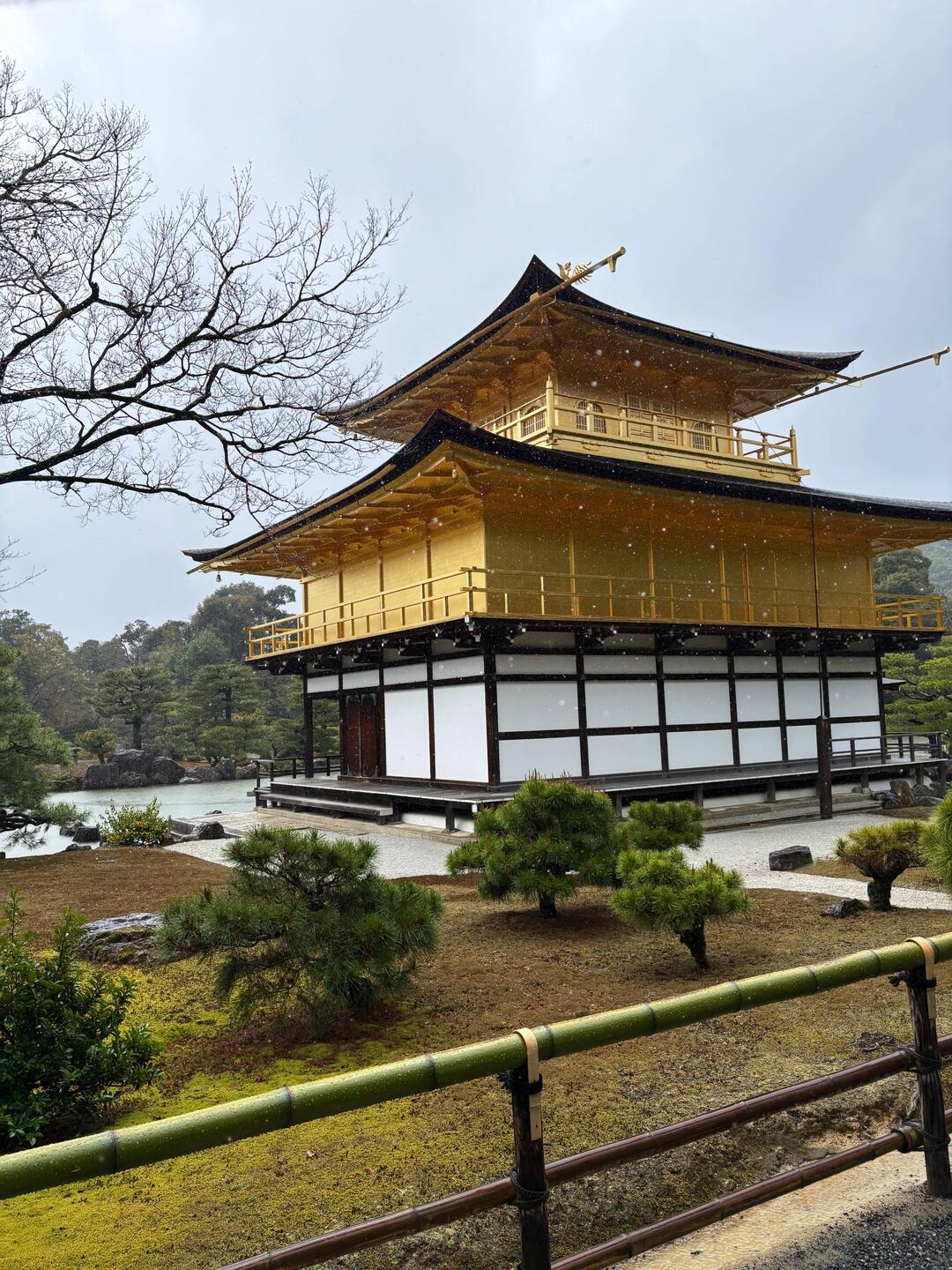 Wir haben den Kinkaku-ji-Tempel in Kyōto besucht – und er hat unsere Erwartungen absolut übertroffen. Der „Goldene Pavillon“ strahlt mit seiner vergoldeten Fassade eindrucksvoll und spiegelt sich wunderschön im ruhigen Teich davor. Die zwei obersten Stockwerke sind mit Blattgold überzogen, daher der Name Goldener Tempel.