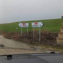Auf diesen Etappen müssen die Pilger häufig an der Straße entlanglaufen, meist versetzt unterhalb der Leitplanke, wo wir heute eine verschnürte Pilgerin kurz vor Belorado sehen. Der Wind ist kalt und obwohl der Regen nachgelassen hat, ist es unangenehm draußen. Aber der Ort ist das Ende einer Etappe und damit dürfte sie nur noch eine halbe Stunde vor einem, hoffentlich, warmen Zimmer sein.Read more