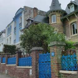 Heute morgen starten wir den nächsten Küstenabschnitt am steinigen Strand von Le Havre. So kurz nach dem Frühstück und auch aufgrund der auf und ab rennenden Menschenmenge mag ich nicht parken, um dem entblößten Strand einen Besuch abzustatten, dessen Wellen fast geräuschlos am Ufer anlegen. Ein paar Strandläufer, eine handvoll Menschen sitzen weit entfernt vom Wasser. Die Strandstrasse biegt links zwischen den Häuser ab, wir drehen, um den Berg hoch zum Leuchtturm zu fahren. Auf dem Weg imposante Häuser, die in die Steigung hineinwachsen.