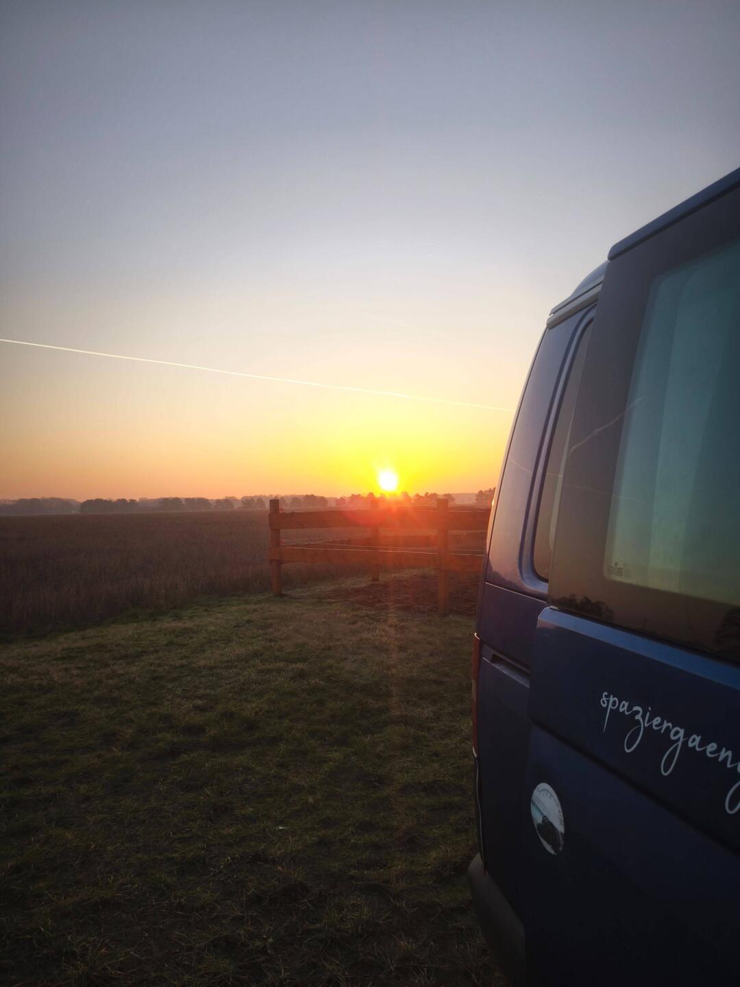 Also mag ich gar nicht aufstehen und bin froh, dass der Thomas mir nicht nur die frisch gewaschene Bettwäsche bringt, sondern gleich die Hilde mit auf ihren Spaziergang nimmt. Frühstück im Sonnenschein, der von hinten den Bus streichelt.