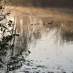 Aus der hinteren Ecke unseres Sees hat sich eine Gruppe von zehn Schwänen gelöst, die dort übernachtet haben, und gleitet still und leise über den See. Aus dem Nebel in die Sonne. Wir sind schon früh draußen, das Gras ist noch nass, und nur weit hinten schüttelt ein nächtlicher Angler sein Zelt aus.