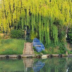 Links von der schmalen Häuserfront nehmen wir den Weg aus der Stadt, ohne zu ahnen, dass wir Christophbirgit und Monet begegnen werden. Unser nächstes Ziel könnte eng mit mir verbunden sein, denn Saint-Pierre-en-Port trägt meinen Namen. Durch grüne Baumreihen an blauen Blüten im Gras führt die einsame Straße durch stilles, kurvenreiches Land, an dessen Wegesrand sich malerische Grundstücke und Häuser gelagert haben, an denen ich mich gar nicht satt sehen kann.