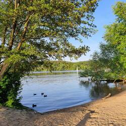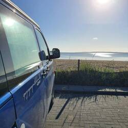 An Margarethe's Strand, wo wir den nächsten Spaziergang am Wasser machen, begegnen wir ihnen nochmal. Eigentlich ist Hundeverbot vom 15.Mai bis 15.September, aber Badegäste treibt es in der frühlingshaften Kälte noch nicht ans Wasser, sodass wir alleine uns wagen, das Gebot zu ignorieren. Am Strand gibt es kleine Parkplätze, ein Toilettenhaus mit einer Außendusche und einem Trinkwasserhahn, wo ich unsere Wasserkanister auffüllen kann.