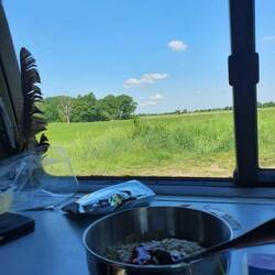So haben wir lange geschlafen, heute morgen in Nienhagen, auf dem kostenlosen Stellplatz. Weil niemand auf uns wartet. Nur wir beide da sind. Auf unserer Reise zum nächsten Meeresrand. So lasse ich mir Zeit mit dem Frühstück, mische für Hilde ein paar leckere Zutaten zusammen, habe dem Regen gelauscht, und sitze im Sonnenschein.