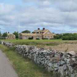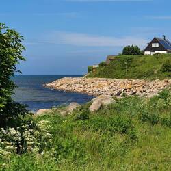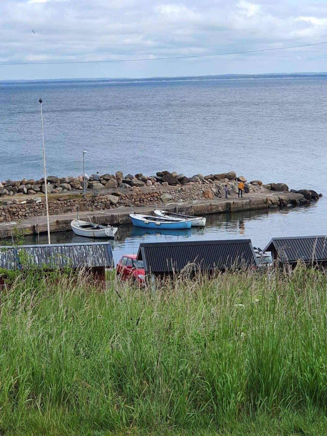 Mit meiner kurzen Hose und den nackten Zehen in den Sandalen bin ich underdresst, finde aber noch Gleichgesinnte unter der männlichen Bevölkerung im Land. Am Morgen in Hittarp sah das eben noch ganz anders aus. Die Straße führt am Wasser entlang, dass dunkelblau zwischen hellen Felsen an Tinte erinnert. Rechter Hand wohnt man in oft kleinen Häusern, und gegenüber ist der weite Blick hinaus auf das Wasser, dass das dänische Land umspült.