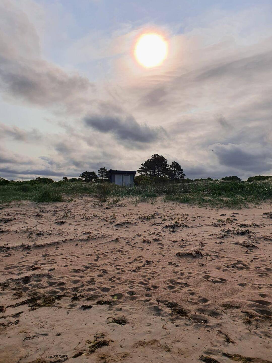 Vistorps Hamn. Ein Stellplatz hinterm kleinen Hafen, mit einem Sandstrand, der gebogen wie die Mondsichel sich unterhalb der Dünen ausbreitet. Wir sind alleine auf unserer Seite, Hilde genießt die Nähe zum Wasser, die Rufe der Vögel auf den Felsen, den Wind, der den Sand bewegt, der um den Bus herum weht.