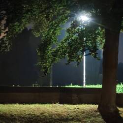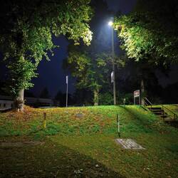 Denn plötzlich ist es warm geworden. Fünfzehn Grad, ich wechsele auf die kurze Hose, die für den Abend schon wieder ein bisschen frisch sein könnte. Aber da gehen wir nur noch kurz an die Luft für Hilde. Denn der Platz liegt dunkel zwischen den Sportfeldern, im Gasthof brennt Licht und auf dem Balkon haben sich Gäste unterhalten. Jetzt ist es still geworden, die Vorhänge sind zugezogen.