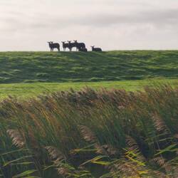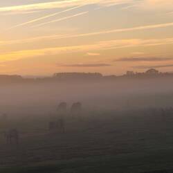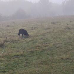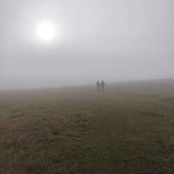 Die beiden Frauen verschwinden mit Hilde im Nebel, während ich mich noch wandertauglich machen muss, was die Anwesenheit des weiblichen Geschlechts nicht grade für nötig erachtet. Hilde kommt durch den Nebel auf mich zu geflitzt, und wir beiden nehmen den Weg gemeinsam, zwischen all den Kuhplatschern, die schon im Trocknungsprozess sich befinden.