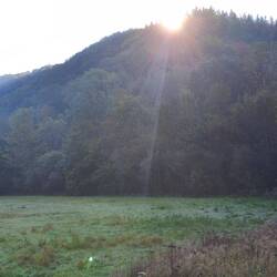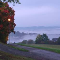 Thick fog covers the countryside, and we set off early to meet Kerstin and Silke at Dörnberg. The road rises out of the valley, winding uphill, curve after curve, until the sun emerges from behind a patch of forest. The closer we get to it, the greater the chance of walking in its light. And how warm it suddenly is, hats and jackets open for a bit of refreshment.