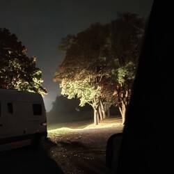 We have a few neighbors camping; one is about to embark on a lifelong journey with his wife and dog. We chat, and I'm happy for her. The air is surprisingly warm, Hilde is following a fresh trail, there's a long-overdue foot bath on the bus, we listen to soft music, and the evening fades into night.もっと詳しく