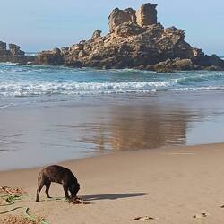 Fahr an den Strand nach Bordeira verabschiedet Georg mich, da gehe ich auch mit Bonito zum Spaziergang hin. Wir verabschieden uns locker auf ein kleines Glasl Portwein in Andalusien im nächsten Monat. Es hat lange gedauert, bis ich Lust bekommen habe, Menschen zu treffen, die ich mag und länger nicht gesehen habe. Um diese Freude zu entwickeln, braucht es eine innere Bereitschaft, die über das normale Maß von Lust an Menschen hinausgeht.