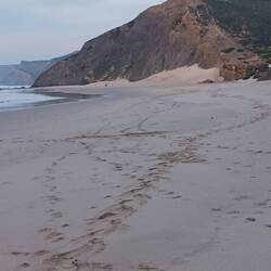 Wir fahren über die Strände von Zavial und Salema, durch eine grüne Landschaft mit kleinen Straßen bis zum Praia da Boca do Rio, wo wir Anja und ihren Hund am Strand treffen, uns angenehm unterhalten, später auf eine gute Art voneinander verabschieden, vielleicht eine positive Erinnerung mit uns tragen. Im Dunkeln fahre ich zurück nach Sagres, weil die Übernachtung im Naturschutzgebiet verboten ist.