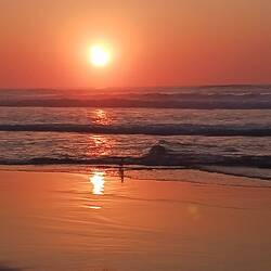 Nichts für Surfer, ein bisschen Nostalgie für Wüstensehnsüchtige, ein Paradies für Hilde und mich. Kaum Menschen, ein Hund, mit dem Hilde jagen übern Sand gespielt hat. Wasser, das übers Meer fliegt, und Sandkörner, die über den Boden fegen. Sturm, der Haare verweht, T-Shirt Wetter für mich, alle anderen Sehsüchtigen tragen mindestens einen Wollpullover."