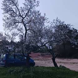 Auf einem sandigen Parkplatz dürfen wir Reisenden übernachten, die Mandelbäume in der Blüte machen den Ort zu einem kleinen romantischen Traum.