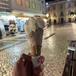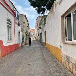 המדרכה היא כמו פסיפס אבנים בצבע אחד ועשב קטנטן מבצבץ בין כל חתיכה לחתיכה.