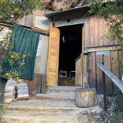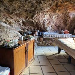 Designed and equipped with an outside porch, a completely enclosed and secured front facade of wooden planks. An extension to the cave roof of plastic and rusted corrugated iron. Pretty much an open-plan arrangement inside, all except the open air/outside shower, basin and thankfully, toilet! All beautifully clean and thought through. There must be all of six or more cave-dwellings in the working farm valley, none in sight of each other.