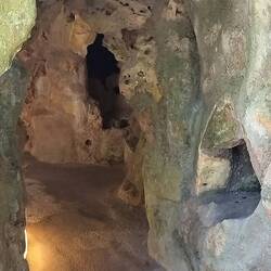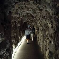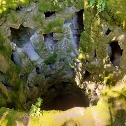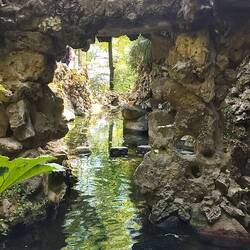 Fra bunden af tårnet bliver vi ført ind i en grotte. Den er flot oplyst og leder os ud til en åbning hvor et vandfald løber ned. Det er virkelig smukt. Meget eventyr agtigt. ☺️ Man kan kunOkumaya devam et