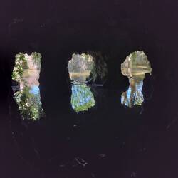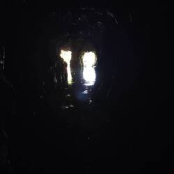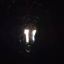 I parken finder vi en stor dam, hvor der er ænder og ællinger i. Men der er også grotter i bagvæggen.... Gad vide om der er en sti derind? Det er der da....