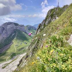 Den næste lille top vi kan gå op på hedder Oberhaupt, 2106 meter over havets overflade. Herfra kan vi se ned over hotellet og plateauet. På modsatte bjergvæg kan man se toget, som vi kom op med.Read more