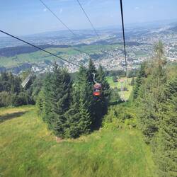 Nu er det tid at tage den første svævebane nedad. Der er plads til 25 personer i gondolen. Så det er begrænset hvor mange billeder jeg har af selve turen. Men på plateauet Fräkmüntegg i 1416Read more