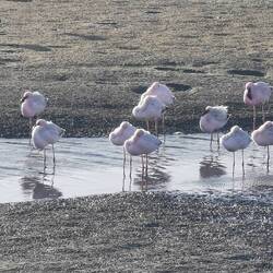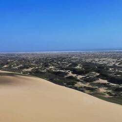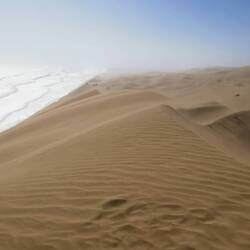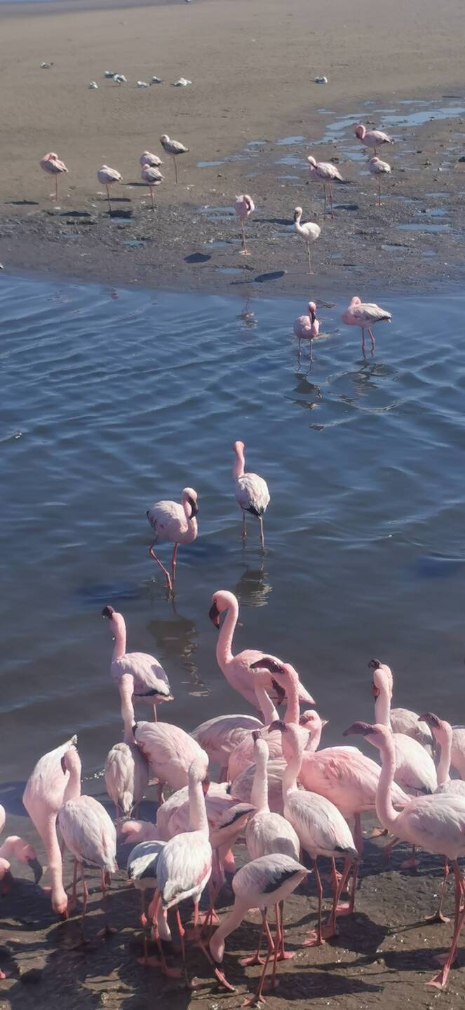 Dann geht's in die Namib - noch ist Nebel - dahinter steckt das wilde Meer. Am Abholort Tausende von Flamingos - da haben wir gestern verzweifelt versucht, die vereinzelt durch die Bucht fliegenden zuBaca lagi