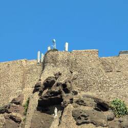Wir hatten kurz überlegt, ob wir uns die Altstadt Sassaris, der 2. größten Stadt Sardinens noch ansehen wollen. Letztes Jahr sind wir auf dem Weg nach Palau durchgefahren und hatten einen guten ersten Eindruck. Aber wir entschieden uns zugunsten eines kleinen, fotogenen Städtchens am Meer dagegen. Hierhin führte uns auch eine Route, die wir noch nicht kannten. Es wurde wieder sehr bergig und zwischen zeitlich hatten wir beide den Eindruck, dass Brenda echt genervt von der Wahl war und sich in die guten alten Zeiten mit dem Vorbesitzer zurück sehnte, wo sie hauptsächlich zwischen Büsum und Kiel pendelte. Sie hat trotzdem alles mitgemacht und uns nach Castelsardo gebracht. Vorher wurden wir noch hart als Wohnmobilisten diskriminiert. Nach einem kurzen Badestop für Michel, ich war nicht so spontan, hatte nicht genug Unterwäsche an und war zu faul, nochmal zum Camper zu gehen, wollten wir die Panorama-Straße nach Castelsardo nehmen. Das wollte die Sarden aber nicht. Die Straße war explizit für Wohnmobile gesperrt. Wir vermuten, da sie es nicht über Gewicht, mehr als 3,5t, geregelt haben, dass es ihnen wirklich um die Wohnmobile geht. Vermutlich waren sie einfach genervt von den Massen. So kamen wir über die Route im Landesinneren nach Castelsardo, wo es schwierig mit dem Parken wurde. Wir mussten uns einmal durch das Städtchen kämpfen und fanden am Ausgang einen großen Sammelplatz. Die Stadt ist wirklich hübsch auf einem Hügel direkt am Wasser gelegen und hat dadurch zwei Buchten. Ganz oben auf dem Hügel thront eine Festung.