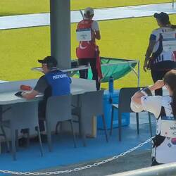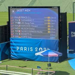 Männer und Frauen haben parallel auf 4 Anlagen geschlossen und von Runde zu Runde immer auf einem anderen. Für uns war weder klar wie viele Runden in der Qualifikation überhaupt insgesamt laufen und erst Recht nicht, welche Gruppe wann auf welchem Stand schießen wird. So haben wir doch einige Runden verpasst, in denen wir die zwei deutschen Frauen und den einen deutschen Mann noch viel besser hätten anfeuern können. Da einige Zuschauer das System aber total im Griff hatten, ist dies aber eindeutig meiner mangelnde Vorbereitung zuzuschreiben. Bemerkenswert empfanden wir die Materialschlacht. Ohne das Finale mit einzurechnen, haben heute 60 Schützen 120 mal auf Tontauben geschossen, das macht 7200 Schrotpatronen und ca. 6500 tote Tauben 😮😮😮 - da die Tonscherben jedoch wieder aufgefegt werden, kam uns der Verdacht, dass die evtl. recycelt werden können? (Recherchearbeit für später)