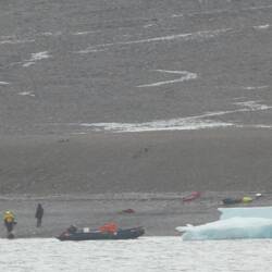 The weather has finally turned. Today we woke to overcast skies, rain and temperatures befitting a freezer - 1 degree, lower with wind chill. It was raining but more like fine hail. It’s the Arctic after all. Strangely, fewer people did today’s landings- given that most on board are either from the UK or Europe, you’d think that they would be use to these conditions. Joyce informed me that it was the rain that convinced her to stay on board - not much fun being in the rain apparently. The first group of kayakers certainly did it tough out on the water as the wind increased and they had to deal with the‘stinging hail’ in their faces. The wind made it too difficult so the second kayaking group was cancelled. The landing was also more difficult because of the weather. The slope up from the landing site became icy and trudging between the artefacts also became harder as they were some distance apart. Although guests were given 70 minutes on shore, most returned early. However, some intrepid souls did both the kayaking and the landing.
