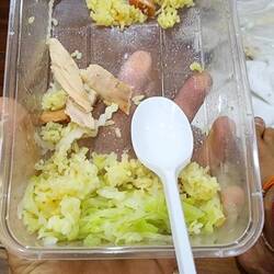 We had breakfast. Bahn (bread) with beef Pho rice noodles soup. Scambled eggs on the side, with some watermelon and dragonfruit.
