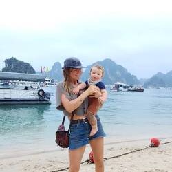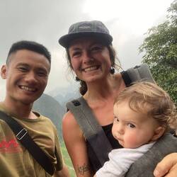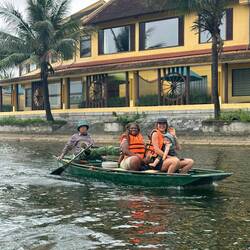 We went through neatly planted rice fields where we saw local people working and the iconic view of mountains, river, rice fields, and the Vietnamese hats poking out from beyond the crops. Bugs woke up on the way back, and I somehow became vigilant of the balance act that was needed to accommodate a moving baby to ensure we didn't have to undertake a man over board procedure. The water in the canal wasn't deep, maybe knee-high, but still wanted to avoid the whole ordeal anyway.