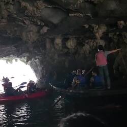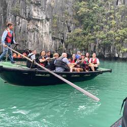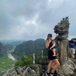 It was time for our boat cruise through Trang An Grottos tour. We were loaded in small canoes with an older local man who would be taking us down the Trang an, little did we know he would be paddling the vessel with his feet!! Down, we go. The water and movements sent buggy to sleep straight away. I used this time to absorb the serve beauty around me and take in the formations of these ancient caves as we glided through. Our guy was paddling with speed, over taking other boats that were cruising. What stamina, I thought, realising he would be doing this for the next 2 hours.