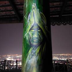 Den ersten Halt machten wir bei einem kleinen Hüttchen, von wo wir auf Chiang Mai heruntersahen. Beim Hüttchen, gab es für die Velofahrer gratis medizinische Versorgung und ein Künstler war am Malen. An den Säulen waren Portraits von Davinci, Dali , Rembrant und Persönlichkeiten der Geschichte von Chiang Mai gemalen. Während wir den Tee genossen, der uns der Maler anbot unterhielten wir uns etwas mit ihm und erfuhren, dass er in Lausanne Kunst studiert hatte. Nach einem letzten beindruckten Blick auf seine Gemälde, setzten wir uns auf dem Roller und fuhren weiter hoch.