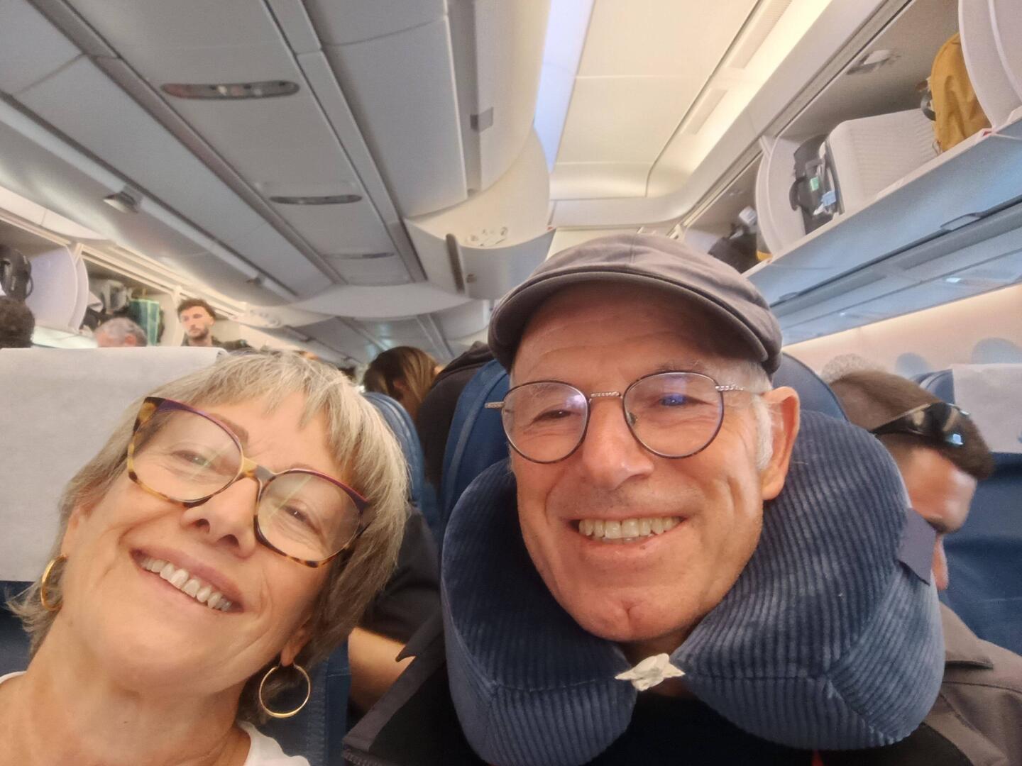 Après quelques péripéties, code de valise de Jacques erroné puis police des frontières refusant ma pièce d'identité pour le départ et enfin avion retardé car valises non chargées..... NousLæs mere