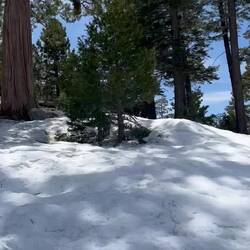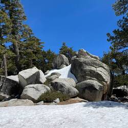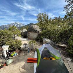 Liebes Tagebuch. Die Zeitlinie unserer Reise wird nun etwas kompliziert, da die kleine Mariam gerade ganz woanders ist und ganz andere Abenteuer erlebt. Aber kommen wir zum Thema: Heute war es endlich soweit. Ich habe es gewagt wieder loszugehen und dieser merkwürdigen Stadt den Rücken zu kehren. Aber vorher gab es noch ein paar Verschwörungstheorien ins Gesicht geworfen und ein paar fundamentale Christen wollten mich in ihren Kult holen. Nix da. Dann kam die Fahrt mit dem Trailangel Grumpy. Aber er war nur ein bischen grumpy. Dafür konnte ich ihm nicht folgen, weil er ohne . und , geredet hat und ständig das Thema wechselte. Er hat mich und ein paar andere an der Black Mountain Road rausgelassen. Von hier waren es 5 oder 6 Meilen bis zum PCT. Also ganz ganz langsam machen und gucken was der Knöchel sagt. Er blieb meist still. Zum Glück. Ab Meile drei ging der Schnee wieder los. Mal nur ein Klecks und dann zwei Meter hoch. Da es nachts nicht mehr gefriert war er ganz matschig und nass. Zack, stehste bis zur Hüfte drin. Das ist sehr anstrengend und manchmal auch etwas gefährlich, wenn man nicht weiß was unter dem Schnee so wartet. Aber, alles gut gegangen. Und dann sah ich endlich das PCT Zeichen. Schnell noch eine Nachricht für Phoenix im Schnee hinterlassen und ab die Post. Die Wegfindung war etwas schwierig. Man muss ein bischen auf die Fußstapfen der anderen vertrauen und ab und zu mal aufs GPS gucken. Der Abstieg ging dann doch auf die Knochen, aber von Schmerzen keine Spur. Irgendwann hörte der Schnee auf und ich stand plötzlich wieder in einer Wüstenlandschaft, welche mir einen schönen Schlafplatz feil bot. Gekauft. Trotzdem komisch ohne die anderen und alleine hier zu sein. Alle anderen Wanderer mussten weiter zur nächsten Quelle. Ich schlauer Fuchs hatte aber bei der letzten Gelegenheit genug mitgenommen.